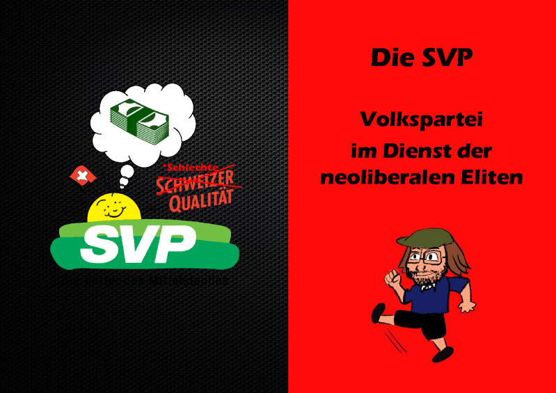 Aber wie ist das möglich? Die SVP unterstützt voll und ganz die neoliberale Politik der Regierung, in der sie auch durch zwei Bundesräte vertreten ist. Sie stellte sich gegen die 13. AHV-Rente, gegen eine Limitierung der Krankenkassenprämien, gegen den Mindestlohn und gilt als stark Gewerkschaftsfeindlich. Im Moment kämpft sie für die unsoziale BVG-Reform. Die SVP steht gemäss ihrer Webseite "für eine geradlinige bürgerliche Politik: Weniger Steuern, weniger Staatsausgaben, für eine schlanke Verwaltung und gute Rahmenbedingungen für die Wirtschaft." Diese Prinzipien sind jene einer neoliberalen Wirtschaftspolitik.