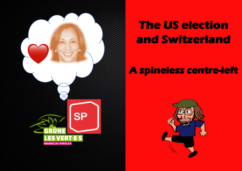 L'attitude du centre-gauche en Europe et en Suisse à l'égard de cette élection a été scandaleuse. Les coprésidents du PS suisse ont déclaré lors du podcast Meyer:Wermuth qu'ils allaient vibrer avec Kamala. Mattea Meyer a déclaré que Kamala Harris représentait « les droits de l'homme, l'État de droit et la démocratie ». Et ce, alors que l'administration Biden/Harris continue à répandre la guerre dans le monde et à soutenir activement un génocide. Les droits de l'homme ne s'appliquent apparemment pas en Palestine.